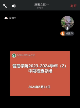 为了解教学情况,推广教学经验,提高教学质量,依据学校本学期期中教学检查工作安排,管理学院进行了为期两周的中期教学检查并于5月14日晚组织召开了2023-2024学年第二学期期中教学检查总结工作会议。会议由教学副院长姚建华主持,管理学院领导班子、各系部主任、全体教师通过云端(腾讯会议)参加了会议。